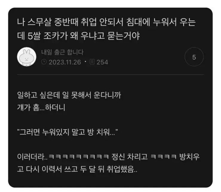 취업 안되서 울고 있는데 5살 조카가 왜 우냐는거야 끝까지간다 0 0 0 12.29 22:58 0 0 https://seulca1.com/bbs/board.php?bo_table=0002&wr_id=88185&page=1 Author 2 0 Lv.15 끝까지간다 15 38,583,988 (42%) 끝까지간다님 보유 포인트 : P 5,014,007 +1 12.30 굿밤되세요~ +1 12.30 출첵 12.29 영어가 우리말을 못 따라올때 12.29 놀라운 주식 대박 사례 12.29 난리난 요즘 MZ 신입 행태