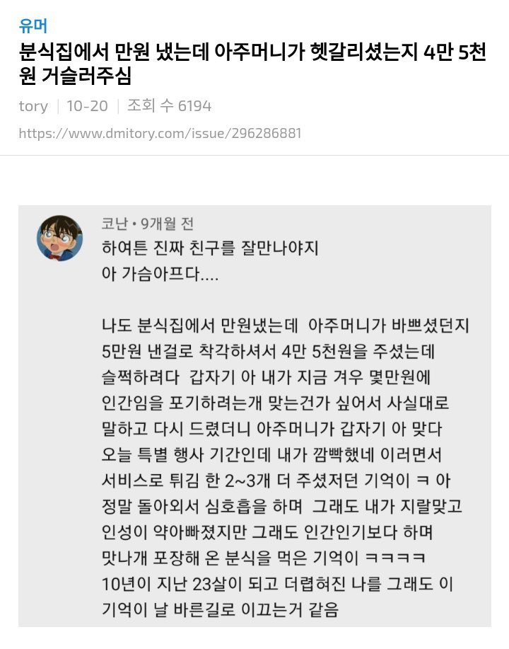 분식집에서 만원 냈는데 헷갈리셨는지 4만 5천원 거슬러주심 끝까지간다 1 0 0 17:29:01 0 0 https://seulca1.com/bbs/board.php?bo_table=0002&wr_id=87618 Author 2 0 Lv.15 끝까지간다 15 36,635,225 (33%) 끝까지간다님 보유 포인트 : P 767,523 +1 12.21 맛저하세요~ +1 12.21 분식집에서 만원 냈는데 헷갈리셨는지 4만 5천원 거슬러주심 12.21 맥주가 죽기전에 남긴 말 12.21 돌맹이 자갈로 그리는 생생한 그림 12.21 다들 힘들면 잠시 쉬세요