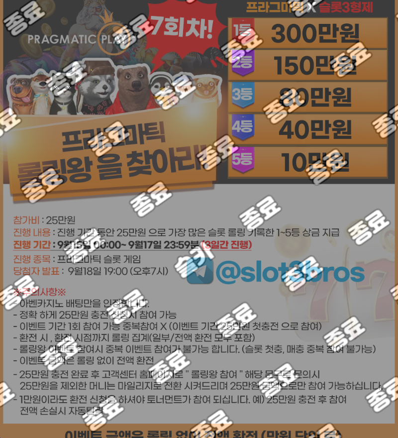 형제들 9월 대박 이벤트 롤링왕 찾아라. (7회차) 최고관리자 종료 8 1062 0 0 2023.09.04 19:41 3형제 X 악동들 X 카메오 9월 롤링왕 이벤트 해당 이벤트는 매달 2번 진행 합니다. 제 7회 롤링왕 이벤트 내용을 잘 읽어보시고 9월15일 부터 많은 롤링을 돌려보세요 ~ 금/토/일 3일 진행 합니다 ※ 사이트는 아벤카지노 만 가능 합니다. 0 0 Author 476 160 Lv.15 최고관리자 15 32,318,567 (11%) 최고관리자님 보유 포인트 : P 4,253,214 +23 04.15 2026년 04월 15일 망고 회원님의 올림푸스 슈퍼스케터 맥스 영상 04.15 출석 +2 04.15 [4월15일] 394회차 오늘의 배당을 찾아라. 번호 발표!! +8 04.14 [4월15일] 394회차 오늘의 배당을 찾아라. 번호 발표!! +22 04.14 2026년 04월 14일 사랑초 회원님의 북몬 맥스 영상