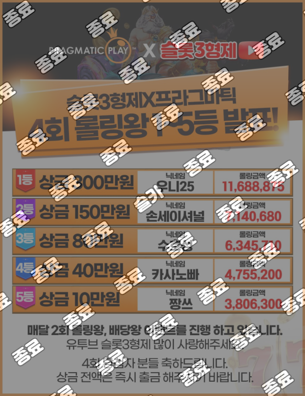 제4회 롤링왕 결과 발표 최고관리자 종료 6 1516 0 0 2023.07.31 16:46 당첨되신 분들 진심으로 축하드립니다 이벤트 후기 < 게시판 가셔서 후기 글을 남기셔야 포인트가 지급 됩니다. 0 0 Author 477 160 Lv.15 최고관리자 15 32,416,385 (12%) 최고관리자님 보유 포인트 : P 4,376,019 04.17 출석 +3 04.17 [4월17일] 93회차 주말의 배당을 찾아라. 번호 발표!! +7 04.16 [4월17일] 94회차 주말의 배당을 찾아라. 번호 발표!! +2 04.16 [4월17일] 수익왕을 찾아라 64회차 +2 04.16 [4월17일] 시안이랑 황금을 찾아라 85회차