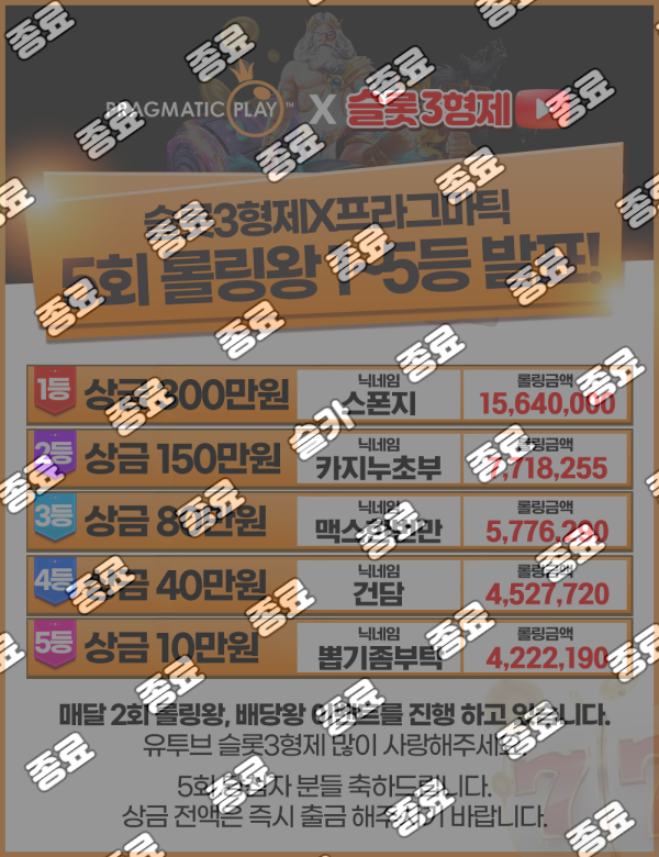 제 5회 롤링왕 결과 발표 최고관리자 종료 9 740 0 0 2023.08.14 18:18 당첨되신 분들 진심으로 축하 드립니다 . 이벤트 후기 < 게시판 가셔서 후기 글을 남기셔야 포인트가 지급 됩니다. 0 0 Author 477 160 Lv.15 최고관리자 15 32,416,585 (12%) 최고관리자님 보유 포인트 : P 4,376,019 04.17 출석 +3 04.17 [4월17일] 93회차 주말의 배당을 찾아라. 번호 발표!! +7 04.16 [4월17일] 94회차 주말의 배당을 찾아라. 번호 발표!! +3 04.16 [4월17일] 수익왕을 찾아라 64회차 +2 04.16 [4월17일] 시안이랑 황금을 찾아라 85회차