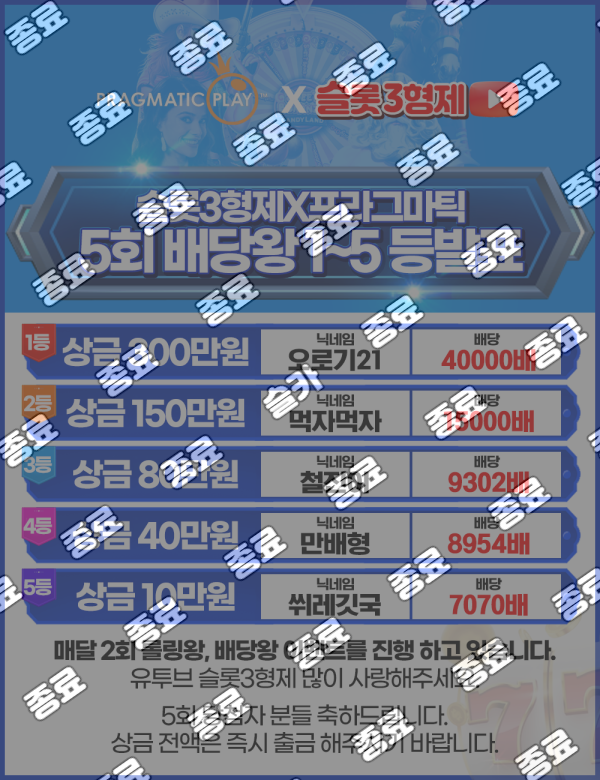 제5회 배당왕 결과 발표 > 슬카 이벤트 | 온라인 슬롯커뮤니티 슬기로운카지노 - 슬카