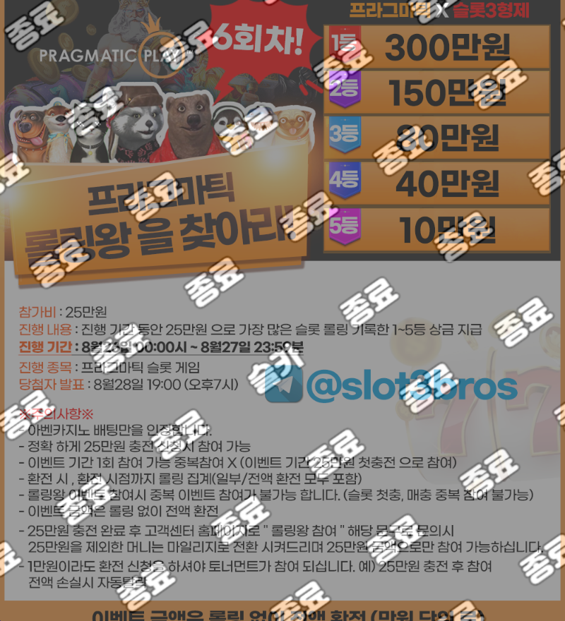 형제들 8월 대박 이벤트 롤링왕 찾아라. (6회차) 최고관리자 종료 8 961 0 0 2023.08.18 17:09 3형제 X 악동들 X 카메오 8월 롤링왕 이벤트 해당 이벤트는 매달 2번 진행 합니다. 제 6회 롤링왕 이벤트 내용을 잘 읽어보시고 8월26일 부터 많은 롤링을 돌려보세요 ~ ※ 사이트는 아벤카지노 만 가능 합니다. 0 0 Author 477 160 Lv.15 최고관리자 15 32,416,385 (12%) 최고관리자님 보유 포인트 : P 4,376,019 04.17 출석 +3 04.17 [4월17일] 93회차 주말의 배당을 찾아라. 번호 발표!! +7 04.16 [4월17일] 94회차 주말의 배당을 찾아라. 번호 발표!! +2 04.16 [4월17일] 수익왕을 찾아라 64회차 +2 04.16 [4월17일] 시안이랑 황금을 찾아라 85회차