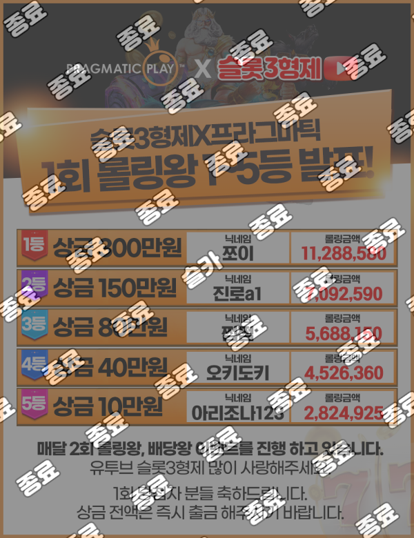 제 1회 롤링왕 결과 발표 최고관리자 종료 16 699 0 0 2023.06.11 17:05 당첨 되신 분들 진심으로 축하드립니다 0 0 Author 476 160 Lv.15 최고관리자 15 32,337,054 (11%) 최고관리자님 보유 포인트 : P 4,296,131 +10 04.16 2026년 04월 16일 진중굴 회원님의 헌티드 맥스 영상 +11 04.16 2026년 04월 16일 스코니 회원님의 멀린 맥스 영상 +12 04.16 2026년 04월 16일 시티 회원님의 북몬 맥스 영상 +3 04.16 [4월16일] 395회차 오늘의 배당을 찾아라. 번호 발표!! +8 04.15 [4월16일] 395회차 오늘의 배당을 찾아라. 번호 발표!!