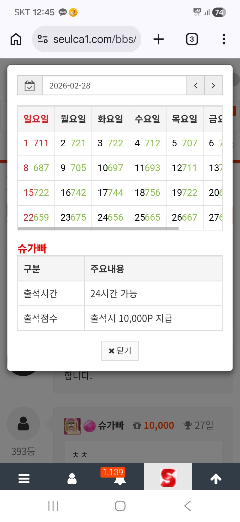 출석 정근 참여합니다 슈가빠 출첵만근 23 50 1 0 02.28 12:46 * 만근이벤트 신청시 스샷 및 내용 필요없이 제목만 '만근 또는 정근 신청합니다.' * 이용하는 놀이터 및 닉네임을 미작성시 당첨 무효가 될수있습니다. 이용 놀이터 호넷 놀이터 닉네임 슈가빠 1 0 Author 0 0 Lv.9 슈가빠 9 4,220,674 (5%) 슈가빠님 보유 포인트 : P 502,036 +1 03.04 와 오늘 바닥진입 +3 03.04 흠 레부.. 100프로 돌발.. +23 03.04 로얄러쉬 529배 +11 03.04 슈천 574배 +17 03.04 로얄러쉬 196배