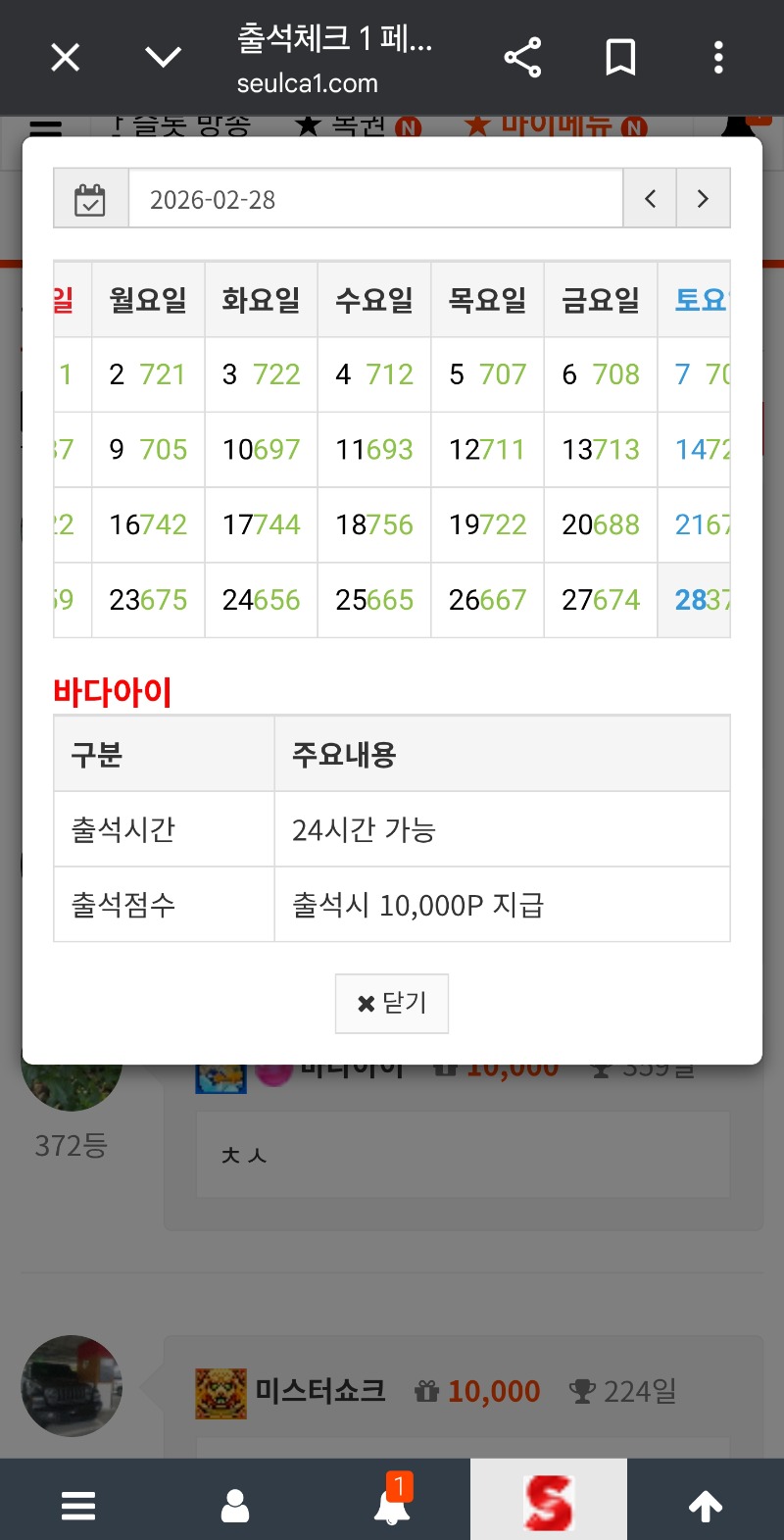 만근신청 합니다 바다아이 출첵만근 20 53 0 0 02.28 04:41 * 만근이벤트 신청시 스샷 및 내용 필요없이 제목만 '만근 또는 정근 신청합니다.' * 이용하는 놀이터 및 닉네임을 미작성시 당첨 무효가 될수있습니다. 이용 놀이터 아벤 놀이터 닉네임 바다아이 0 0 Author 2 0 Lv.11 바다아이 11 10,599,100 (19%) 바다아이님 보유 포인트 : P 774,894 +8 03.04 오라메 5000배 +39 03.04 오라메 맥스 03.04 ㅊㅅ 03.03 ㅊㅅ 03.02 ㅊㅅ