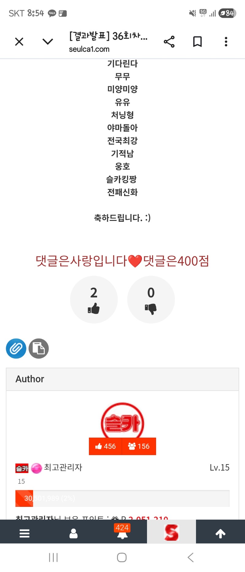 배당왕 룰렛당첨 인증이요~~~ 슬카킹짱 배당왕 24 89 3 0 03.01 21:42 * 만근이벤트 신청시 스샷 및 내용 필요없이 제목만 '만근 또는 정근 신청합니다.' * 이용하는 놀이터 및 닉네임을 미작성시 당첨 무효가 될수있습니다. 이용 놀이터 우르스 놀이터 닉네임 존먓탱 3 0 Author 1 1 Lv.12 슬카킹짱 12 16,091,469 (61%) 슬카킹짱님 보유 포인트 : P 44,749 +2 03.30 좋은 아침입니다~~ 03.30 출석 +1 03.29 [비밀글] 주복6등신청 +1 03.29 [비밀글] 주복10등신청 +2 03.29 날씨도 좋은데 꽃구경갑니다~~~