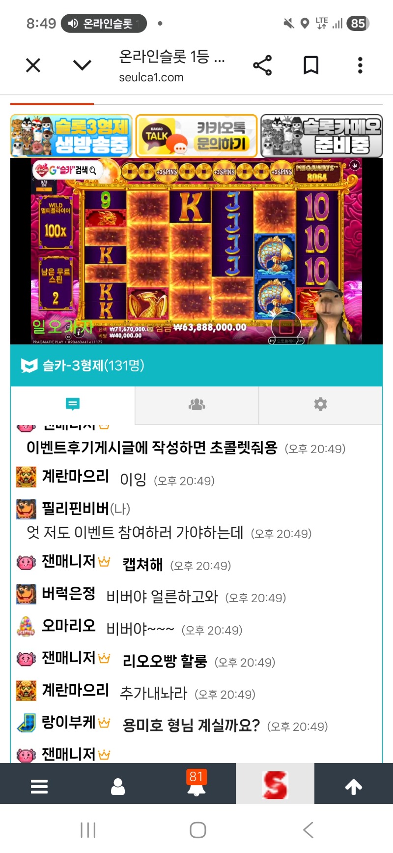 발렌타인 이벤트 참여!! 필리핀비버 발렌타인 2 17 0 0 02.14 20:51 * 만근이벤트 신청시 스샷 및 내용 필요없이 제목만 '만근 또는 정근 신청합니다.' * 이용하는 놀이터 및 닉네임을 미작성시 당첨 무효가 될수있습니다. 이용 놀이터 시안 놀이터 닉네임 필리핀비버 0 0 Author 2 1 Lv.9 필리핀비버 9 4,808,182 (20%) 필리핀비버님 보유 포인트 : P 131,974 03.01 ㅊㅊ 02.27 ㅊㅊ 02.24 ㅊㅊ 02.21 ㅊㅊ 02.20 ㅍㅊ
