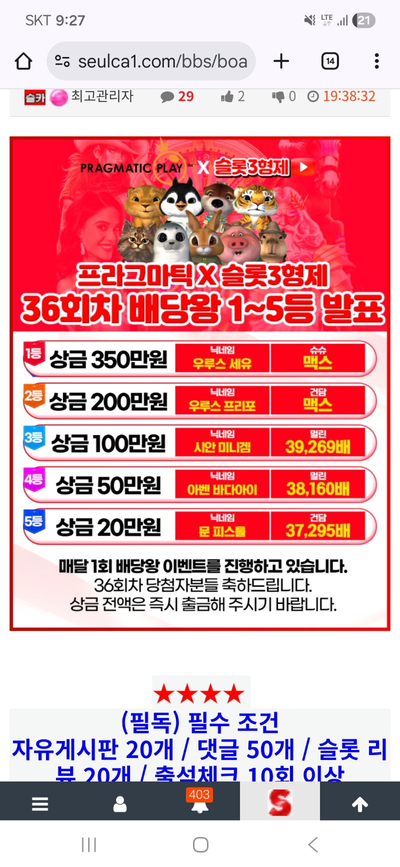 배당왕 2등 감사합니다! 프리포 배당왕 20 60 2 0 03.01 21:29 * 만근이벤트 신청시 스샷 및 내용 필요없이 제목만 '만근 또는 정근 신청합니다.' * 이용하는 놀이터 및 닉네임을 미작성시 당첨 무효가 될수있습니다. 이용 놀이터 우르스 놀이터 닉네임 프리포 얼떨떨하네요. 2등 감사합니다^^ 그리고 슬카는 사랑입니다♡ 2 0 Author 1 0 Lv.9 프리포 9 6,185,155 (54%) 프리포님 보유 포인트 : P 1,410,324 03.03 출첵 갓짬~ 03.03 ㅊㅊ +32 03.02 멀린 1862배 +22 03.02 뜻 깊은 2월 슬카 당첨글 03.02 ㅊㅊ