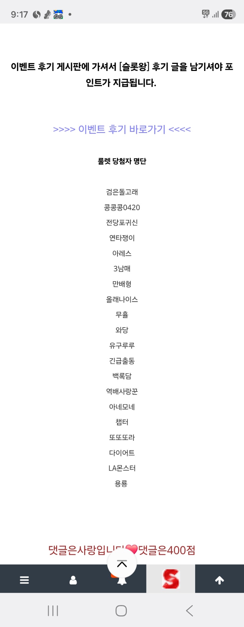 슬롯왕룰렛당첨 유구루루 슬롯왕 5 14 0 0 21:18:14 * 만근이벤트 신청시 스샷 및 내용 필요없이 제목만 '만근 또는 정근 신청합니다.' * 이용하는 놀이터 및 닉네임을 미작성시 당첨 무효가 될수있습니다. 이용 놀이터 우루스 놀이터 닉네임 유구루루 0 0 Author 4 2 Lv.13 유구루루 13 18,104,313 (2%) 유구루루님 보유 포인트 : P 90,269 +5 04.12 슬롯왕룰렛당첨 +1 04.12 [비밀글] 50만포교 +20 04.12 슬롯왕종료 04.12 ㅊㅅ 04.11 ㅊㅅ