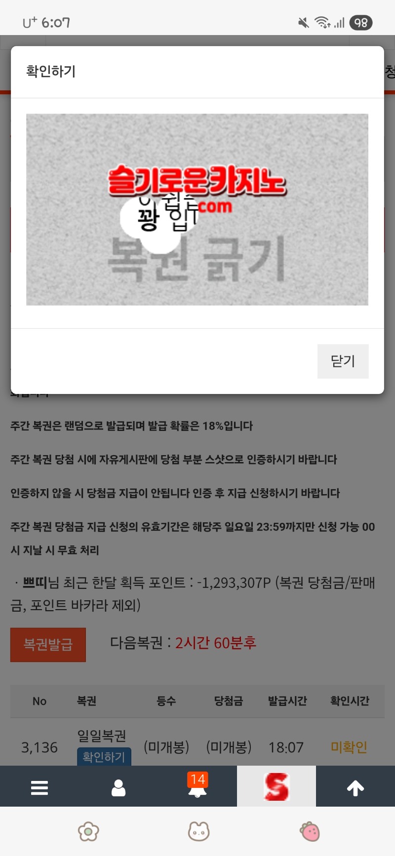 저녁 복권 꽝 쁘띠 0 0 0 18:07:42 *기프티콘 바코드 노출 주의* <- 0 0 https://seulca1.com/bbs/board.php?bo_table=free&wr_id=3402729&page=1 Author 15 4 Lv.17 쁘띠 17 71,976,864 (6%) 쁘띠님 보유 포인트 : P 1,044,693 12.20 저녁 복권 꽝 12.20 다시 꽝 모드네~ 12.20 출첵 +2 12.20 첫복권 꽝 +1 12.19 점심 복권 꽝