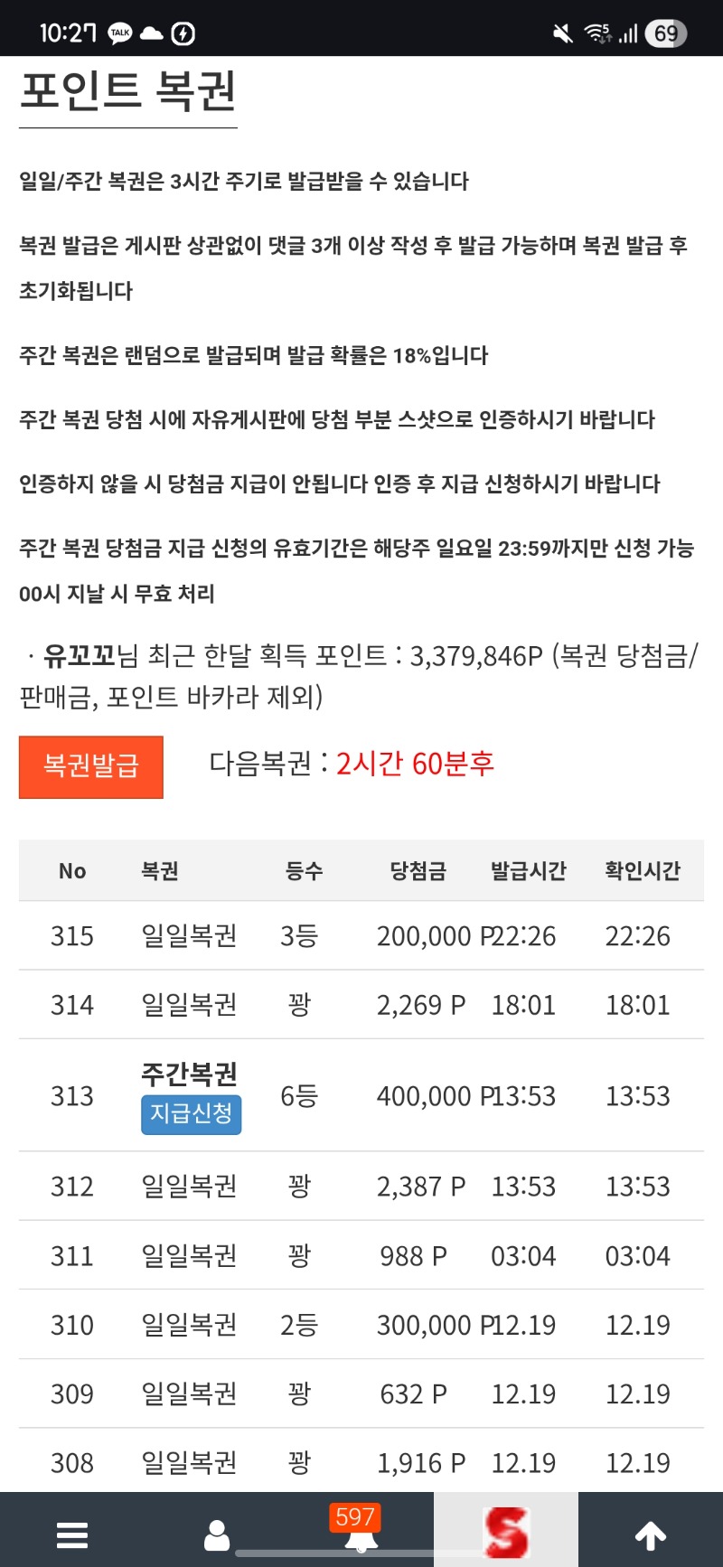 오!!!!!대받쓰 유꼬꼬 9 0 0 12.20 22:27 *기프티콘 바코드 노출 주의* <- 오늘 주복에 일복까지 나이스 0 0 https://seulca1.com/bbs/board.php?bo_table=free&wr_id=3403411&page=1 Author 1 0 Lv.9 유꼬꼬 9 6,175,211 (54%) 유꼬꼬님 보유 포인트 : P 1,051,396 +2 12.20 시뎅이ㅜ +9 12.20 오!!!!!대받쓰 +1 12.20 로또 1번이네.. +3 12.20 맛점하세영 +11 12.20 주복 6등