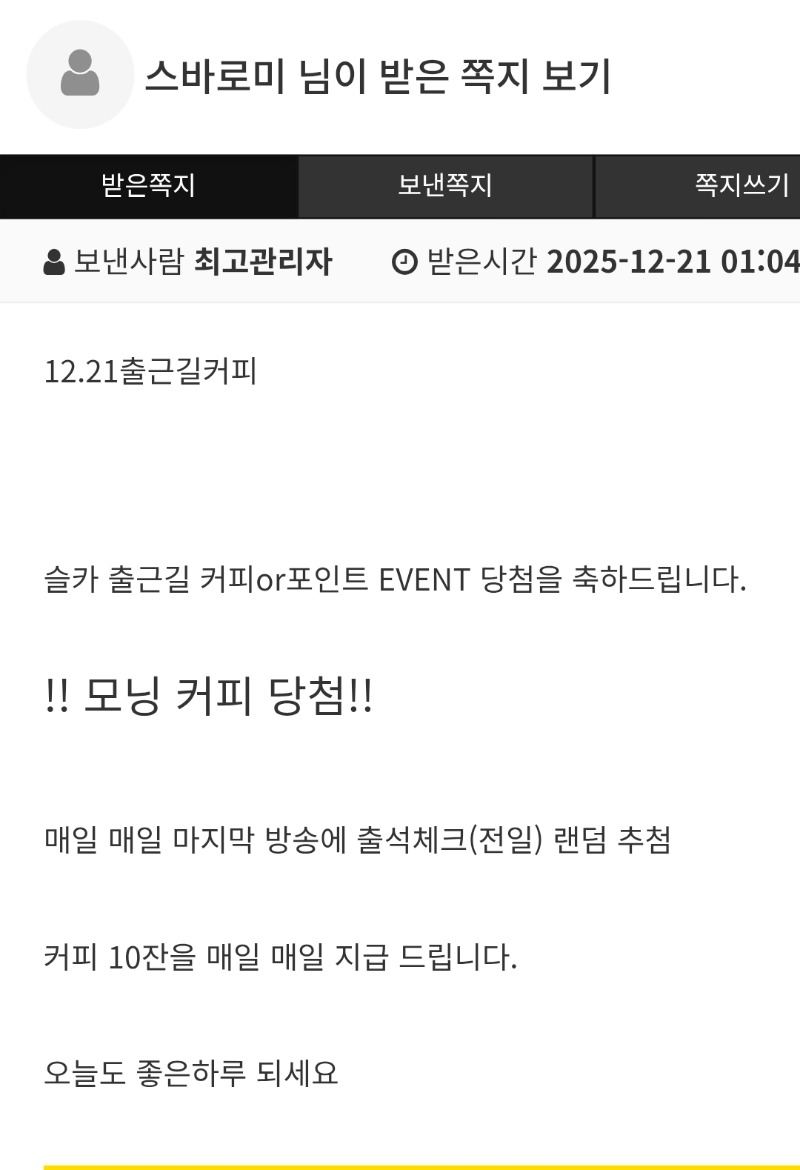 모닝커피당첨! 스바로미 3 0 0 08:45:03 *기프티콘 바코드 노출 주의* <- 잘마실께요~~~ 0 0 https://seulca1.com/bbs/board.php?bo_table=free&wr_id=3404092&page=1 Author 3 0 Lv.12 스바로미 12 13,629,338 (12%) 스바로미님 보유 포인트 : P 314,526 +3 12.21 모닝커피당첨! +3 12.17 미니형난 피자 당춈! +1 12.05 [비밀글] 쿠폰교환 12.05 가족방 배민쿱 감솨~ +2 11.30 포교신청 완료!