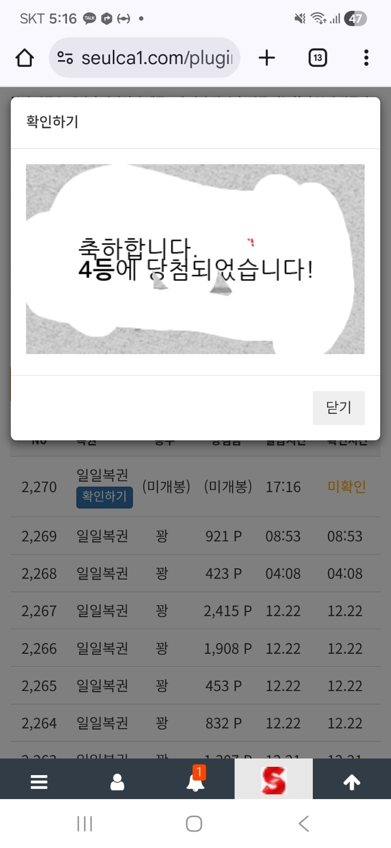 일복4등 당첨 간절합니다 6 0 0 17:17:37 *기프티콘 바코드 노출 주의* <- 0 0 https://seulca1.com/bbs/board.php?bo_table=free&wr_id=3410767&page=1 Author 2 0 Lv.13 간절합니다 13 18,331,589 (6%) 간절합니다님 보유 포인트 : P 2,000 +3 12.23 슬카라. 적특 뎅뎅. 공식인거. 같네요 +6 12.23 일복4등 당첨 +4 12.22 오늘 고생하셨습니다 전 루징뎅 30분간. 질놀음 +5 12.21 포교 마지막 기회 +2 12.21 슬용호 깡 계속실패