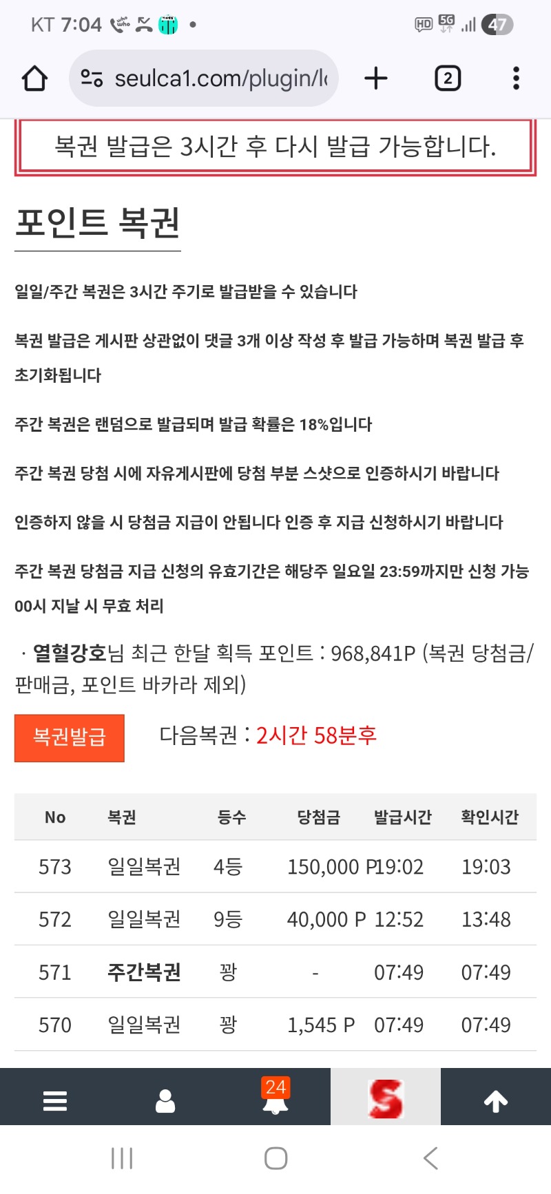 일복대박 10등9등4등까지. ㅎㅎ 열혈강호 5 0 0 19:05:36 *기프티콘 바코드 노출 주의* <- 0 0 https://seulca1.com/bbs/board.php?bo_table=free&wr_id=3411134&page=1 Author 0 0 Lv.8 열혈강호 8 3,409,755 (40%) 열혈강호님 보유 포인트 : P 1,610,744 +5 12.23 일복대박 10등9등4등까지. ㅎㅎ +5 12.23 일복9등 10에이엨ㅋ 12.23 굿모닝. 아침 쌍복 다 꽝이너 ㅋ +4 12.22 일복10등 올만에 ㅋ 12.22 역시 모님복권 꽝