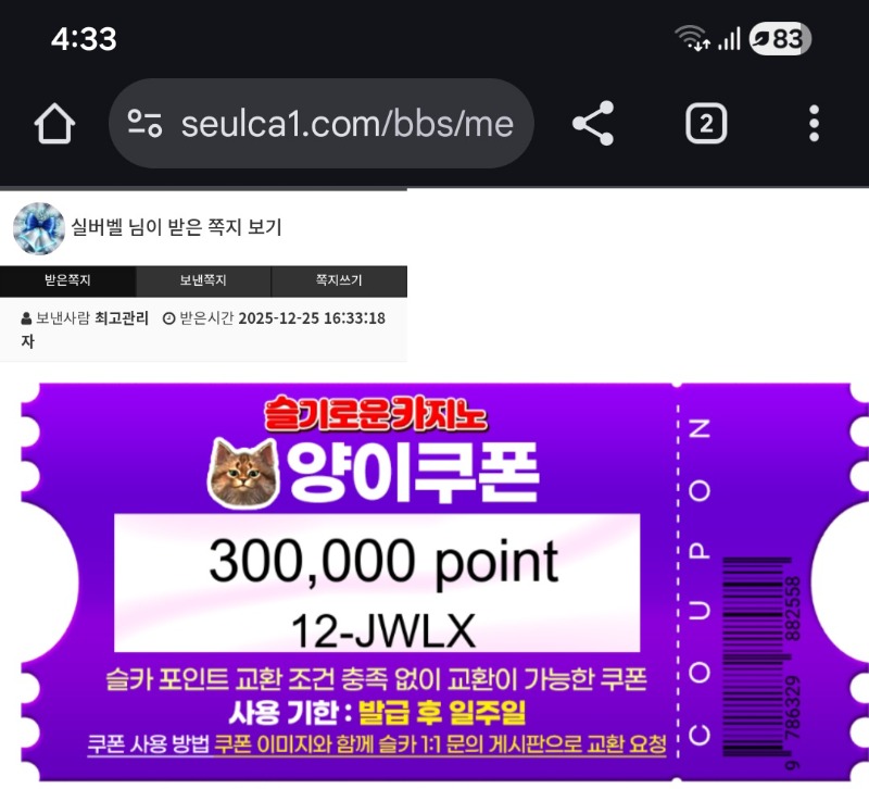 양이의 크리스마스선물~~~ 실버벨 3 0 0 16:36:00 *기프티콘 바코드 노출 주의* <- 고마워~~~ 깡치기 가야하 ~~~~ 0 0 https://seulca1.com/bbs/board.php?bo_table=free&wr_id=3416144&page=1 Author 10 7 Lv.18 실버벨 18 135,100,656 (58%) 실버벨님 보유 포인트 : P 2,524,401 +4 12.25 이번에는 무네ㅎㅎ +4 12.25 또 승ㅎㅎ +4 12.25 바카라1승ㅋㅋ +8 12.25 양이쿤폰 깡치기 가야하~~~ +8 12.25 슬카생활2년만에. 처음이네ㅎㅎ