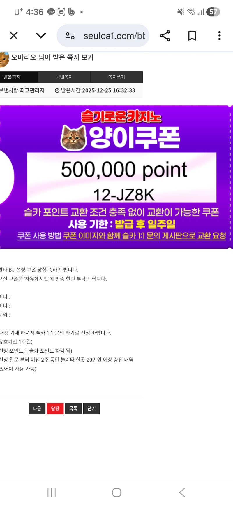 양이 핀볼게임 양쿱 당첨~~~ 오마리오 2 0 0 16:37:05 *기프티콘 바코드 노출 주의* <- 나이스~~~~ 0 0 https://seulca1.com/bbs/board.php?bo_table=free&wr_id=3416150&page=1 Author 4 0 Lv.16 오마리오 16 56,752,114 (33%) 오마리오님 보유 포인트 : P 700,450 +2 12.25 양이 핀볼게임 양쿱 당첨~~~ +2 12.25 물개 댓글 포인트~~~5만 +10 12.25 일복이 6등~~ +6 12.25 일복이 5등~ +11 12.25 토라메 166배
