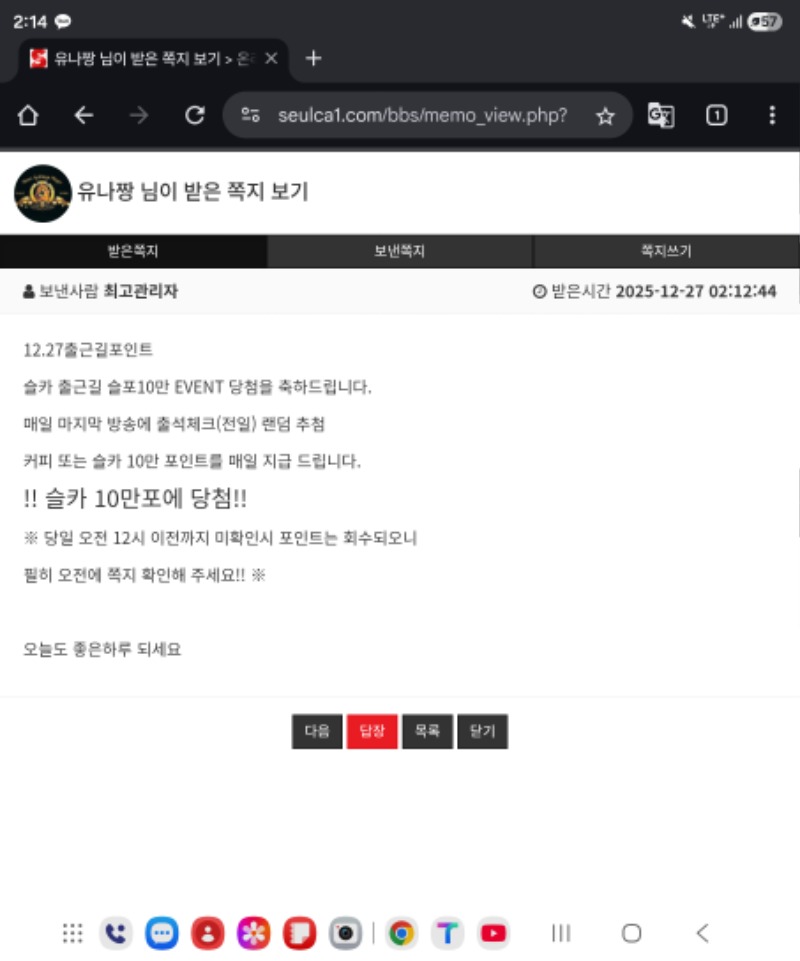 출근길포인트당첨^^ 유나짱 4 1 0 02:17:21 *기프티콘 바코드 노출 주의* <- 1 0 https://seulca1.com/bbs/board.php?bo_table=free&wr_id=3421323&page=1 Author 0 0 Lv.9 유나짱 9 5,993,261 (49%) 유나짱님 보유 포인트 : P 1,024,359 +4 12.27 출근길포인트당첨^^ +16 12.26 오라이언185 +6 12.26 오라이언110 +13 12.26 오라이언295 +8 12.26 닭집171