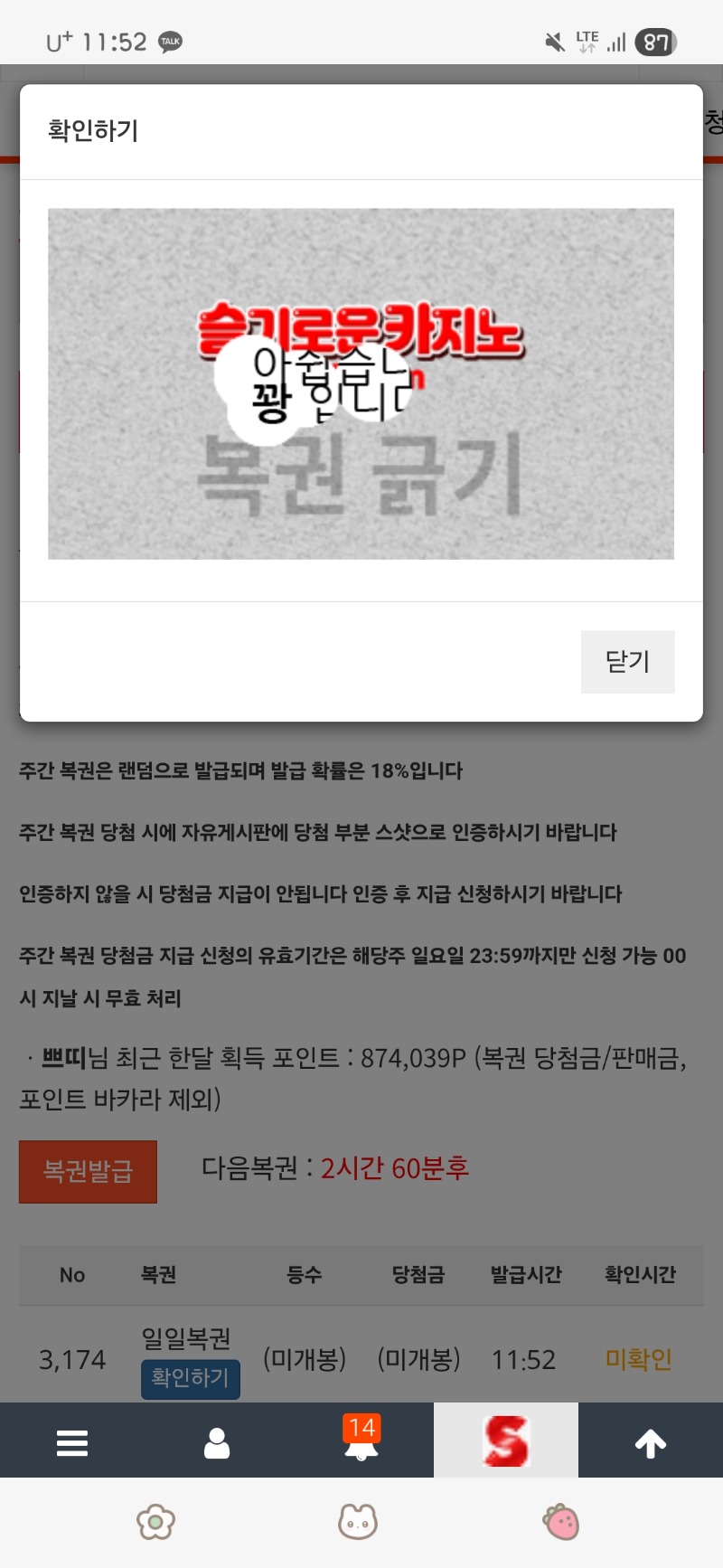 점심 복권 꽝 쁘띠 3 0 0 11:53:06 *기프티콘 바코드 노출 주의* <- 0 0 https://seulca1.com/bbs/board.php?bo_table=free&wr_id=3427189&page=1 Author 15 4 Lv.17 쁘띠 17 72,701,880 (9%) 쁘띠님 보유 포인트 : P 1,552,832 +3 12.28 점심 복권 꽝 +16 12.28 아침 복권 꽝 +2 12.28 첫복권 꽝 +39 12.28 얼음낚시 세번째~~본전 +20 12.28 얼음낚시 두번째3곱~~