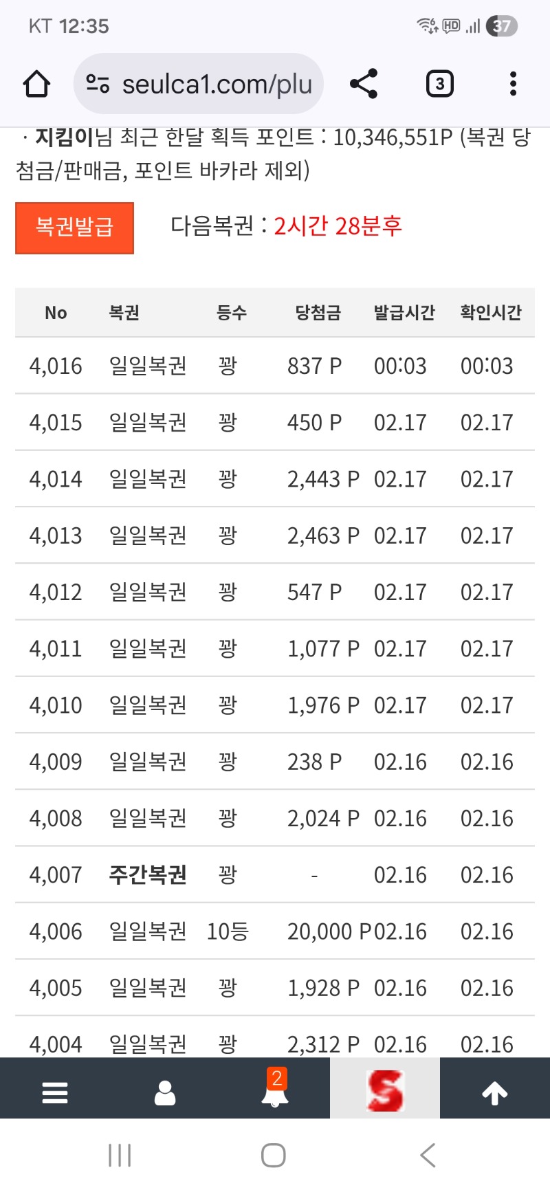 이쯤되면 일복1등 나올때가 됐는데~~ 지킴이 2 0 0 02.18 00:37 *기프티콘 바코드 노출 주의* <- 0 0 https://seulca1.com/bbs/board.php?bo_table=free&wr_id=3594807&page=11 Author 10 5 Lv.18 지킴이 18 155,628,544 (92%) 지킴이님 보유 포인트 : P 17,850 +1 03.14 모닝복권은..꽝 +2 03.14 굿모닝입니다 +2 03.14 전이만..굿밤여 03.14 첫일복은..꽝 03.14 고모 리필여