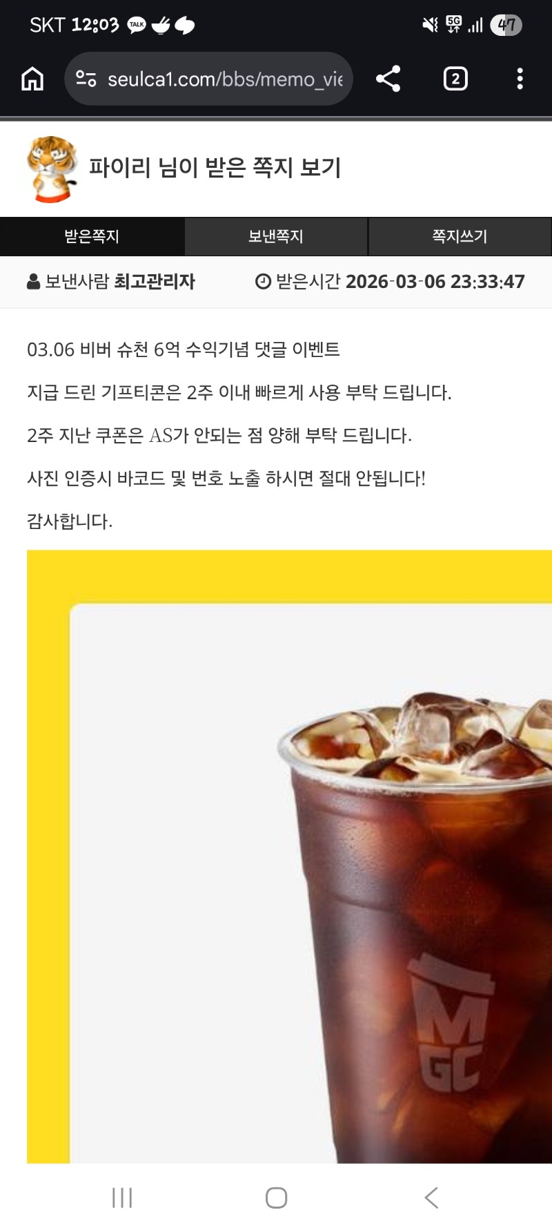 비버 수익커피 ㅅㅅ 파이리 6 0 0 00:04:45 *기프티콘 바코드 노출 주의* <- 0 0 https://seulca1.com/bbs/board.php?bo_table=free&wr_id=3653605&page=11 Author 2 1 Lv.12 파이리 12 17,001,697 (80%) 파이리님 보유 포인트 : P 9,795 +2 03.07 네 그렇습니다 꽝이네요 ㅎ +5 03.07 이모~ +6 03.07 주복팝니다~~~ +10 03.07 아먼데...자꾸 쌍복오냐 ㅋㅋ 2번째쌍복 +8 03.07 오늘도 출첵하고..먼저 자러가버겠슺니다!!