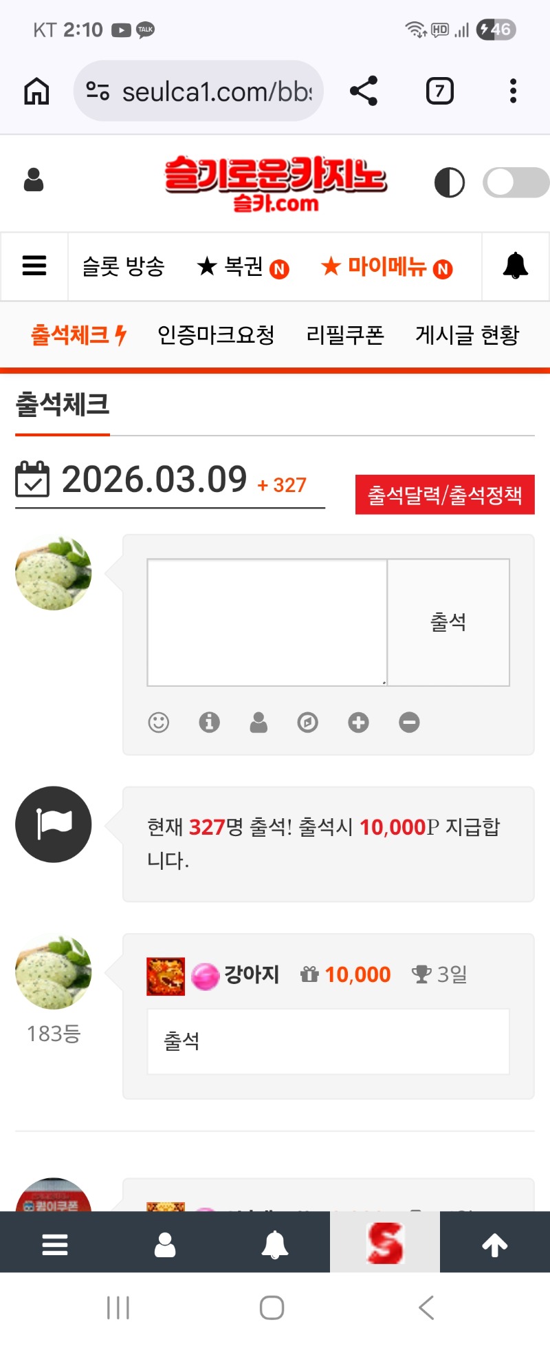 출책 원점이지만 새로운 마음으로 달려보자*^^ 강아지 1 0 0 03.09 02:12 0 0 https://seulca1.com/bbs/board.php?bo_table=free&wr_id=3663132&page=11 Author 0 0 Lv.14 강아지 14 24,072,740 (15%) 강아지님 보유 포인트 : P 744,069 +2 03.10 펭이 방송보면서 재미있었네 이제 자야겠네요 ^^^ +2 03.09 활동포 감사합니다 *^^* +23 03.09 뱀피 129배 +4 03.09 새로운 한주가 시작 되었네요 *^^ +32 03.09 락베가스 236배