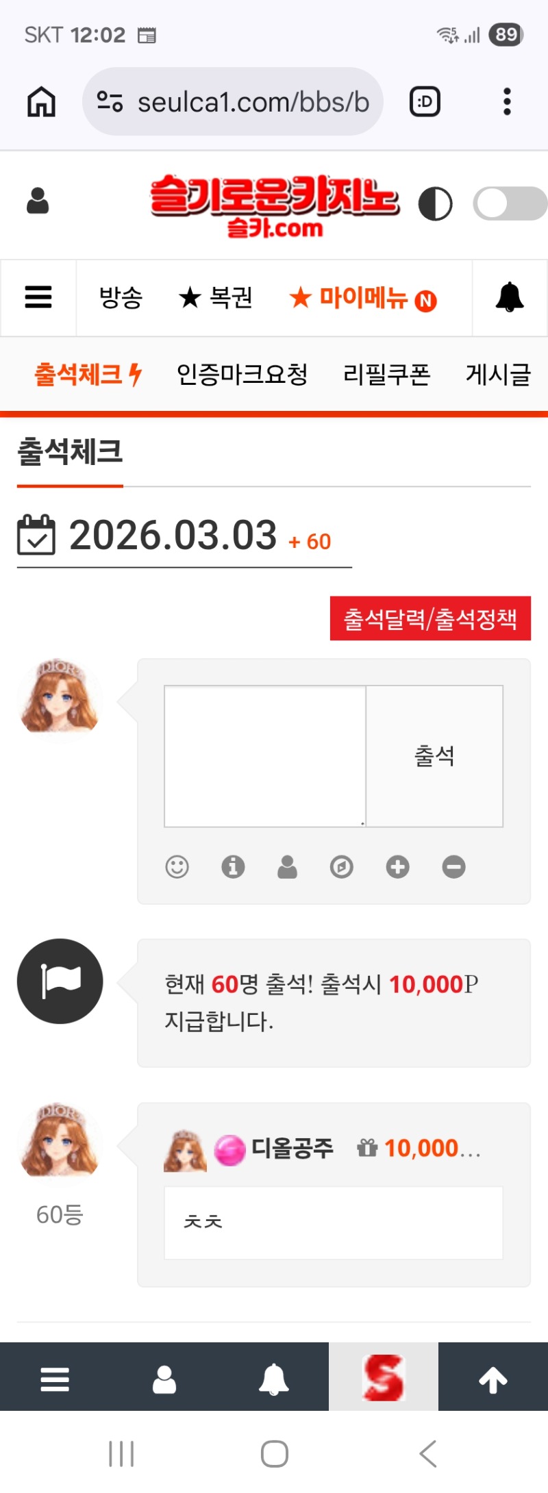 출첵합시다 디올공주 0 0 0 00:02:32 *기프티콘 바코드 노출 주의* <- 0 0 https://seulca1.com/bbs/board.php?bo_table=free&wr_id=3638637&page=13 Author 23 15 Lv.19 디올공주 19 192,350,610 (0%) 디올공주님 보유 포인트 : P 21,275 +6 03.03 럭피990배*600냥 +1 03.03 맛점하세요 +20 03.03 세판이면 마무리7대3승 +16 03.03 연승 뒷발좋구 +32 03.03 모닝카라 네츄럴 승