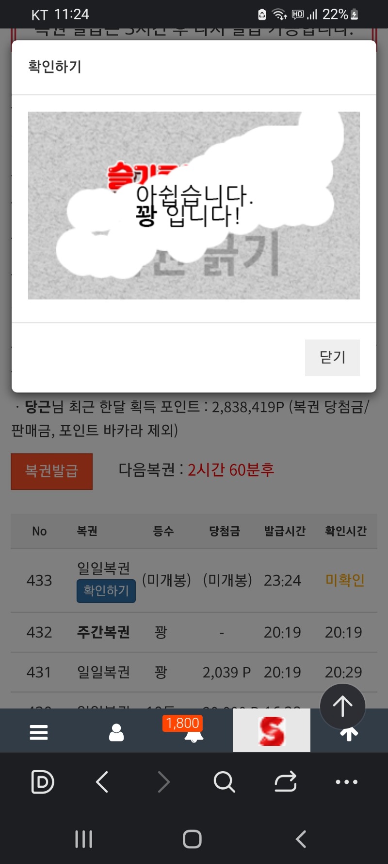 오늘 마지막 복권은 역시나 꽝 당근 1 0 0 03.02 23:25 *기프티콘 바코드 노출 주의* <- 0 0 https://seulca1.com/bbs/board.php?bo_table=free&wr_id=3638555&page=14 Author 0 0 Lv.9 당근 9 5,017,385 (25%) 당근님 보유 포인트 : P 1,302,099 +1 03.03 맛점 하세요~~ +2 03.03 커피 한잔 하세요 +3 03.03 평일 아침은 주복 까면서 시작~ +3 03.03 굿모닝 입니다 +7 03.03 마담 213 리플 없음