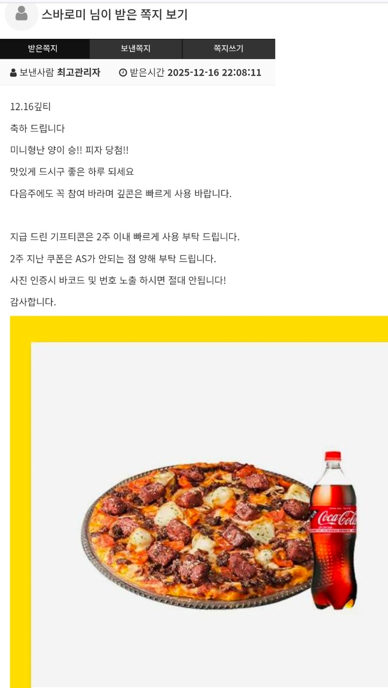 미니형난 피자 당춈! 스바로미 3 0 0 08:11:48 *기프티콘 바코드 노출 주의* <- 감사합니다~ 잘먹을께요~ 0 0 https://seulca1.com/bbs/board.php?bo_table=free&wr_id=3392569&page=2 Author 3 0 Lv.12 스바로미 12 13,559,401 (11%) 스바로미님 보유 포인트 : P 453,134 +3 12.17 미니형난 피자 당춈! +1 12.05 [비밀글] 쿠폰교환 12.05 가족방 배민쿱 감솨~ +2 11.30 포교신청 완료! +1 11.30 [비밀글] 포인트교환