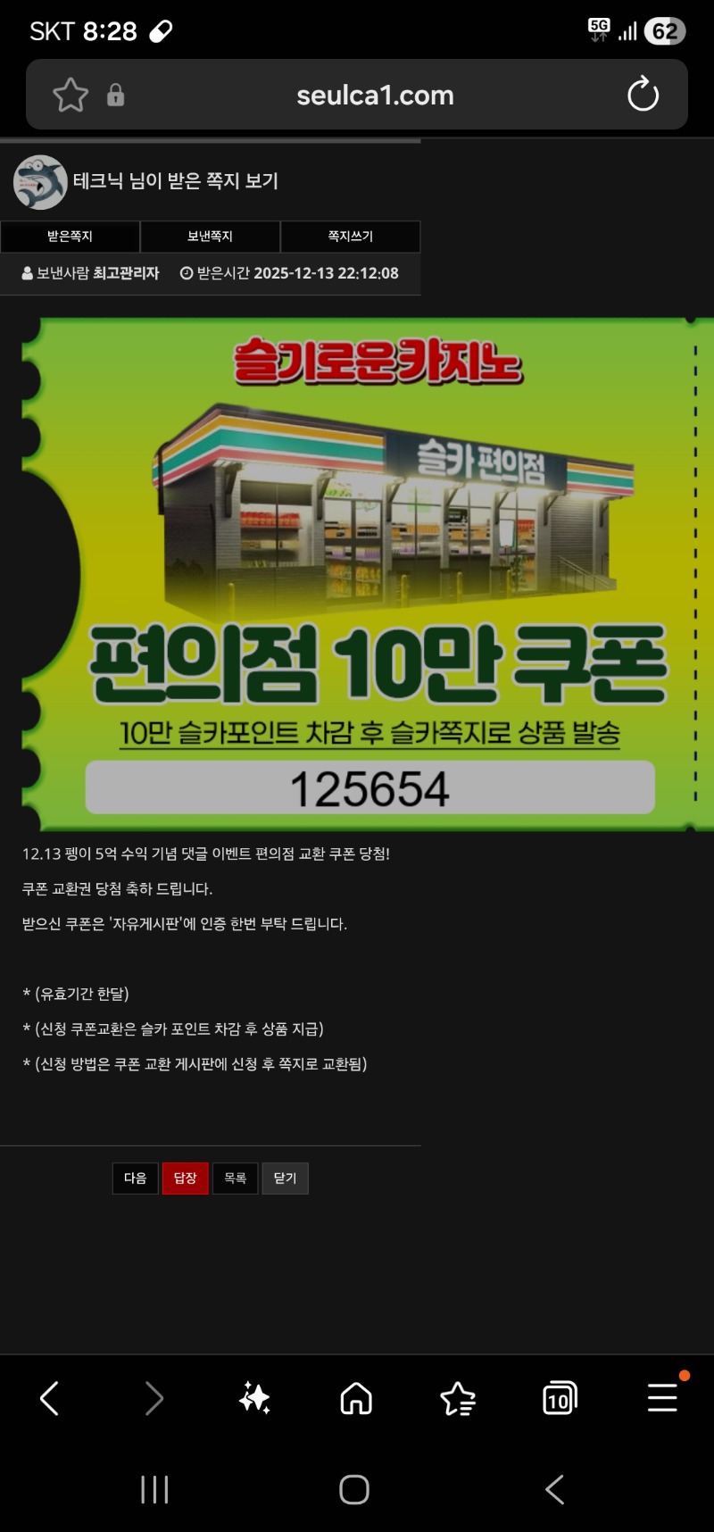 펭이 수익기념 편의점 쿠폰 ㅅㅅ 테크닉 3 0 0 12.14 20:31 펭이 수익기념 쿠폰*기프티콘 바코드 노출 주의* <- ㅅㅅㅅㅅ 0 0 https://seulca1.com/bbs/board.php?bo_table=free&wr_id=3385185&page=3 Author 1 0 Lv.11 테크닉 11 11,815,077 (60%) 테크닉님 보유 포인트 : P 1,684,694 +1 12.14 [비밀글] 50만 포인트 교환 +1 12.14 [비밀글] 편의점 쿠폰 교환 +3 12.14 펭이 수익기념 편의점 쿠폰 ㅅㅅ +7 11.23 주간 복권 4등 인증 +1 11.23 [비밀글] 주간복권 4등 신청