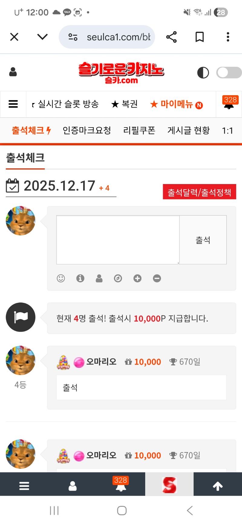 출석합니다~~ 오마리오 0 0 0 00:01:12 *기프티콘 바코드 노출 주의* <- 2년까지 60일 남았네 ㅎ 0 0 https://seulca1.com/bbs/board.php?bo_table=free&wr_id=3391856&page=3 Author 4 0 Lv.16 오마리오 16 56,267,305 (31%) 오마리오님 보유 포인트 : P 900,000 +1 12.17 한돈이 추천게임~~슬포 12.17 출석합니다~~ +1 12.16 토끼 추천게임당첨~~ 12.16 미니형난~~양아 홧팅 +1 12.16 양이추천게임 당첨~~