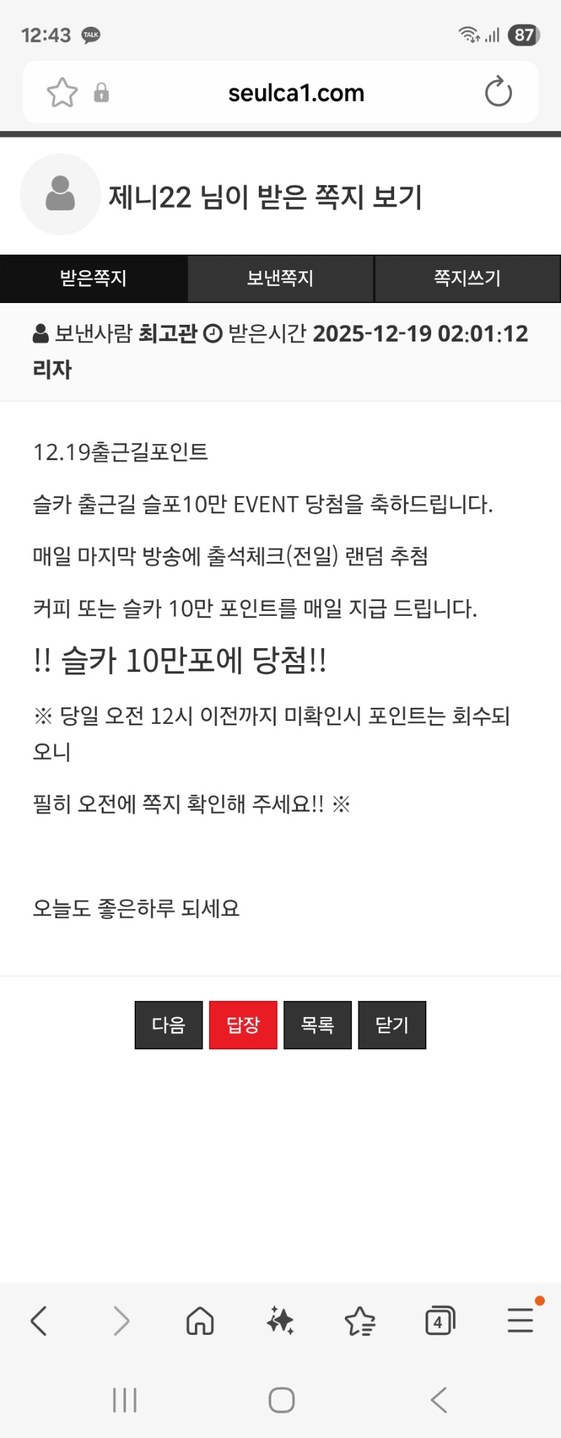 출근길 슬포 제니22 1 0 0 12:44:56 *기프티콘 바코드 노출 주의* <- 감사합니다 0 0 https://seulca1.com/bbs/board.php?bo_table=free&wr_id=3399519&page=3 Author 3 0 Lv.12 제니22 12 15,515,212 (50%) 제니22님 보유 포인트 : P 2,206 +1 12.19 출근길 슬포 12.19 맛점하세요 +1 12.18 아..오늘 야근이 +2 12.18 맛점하세요 +1 12.17 내일은 목요일