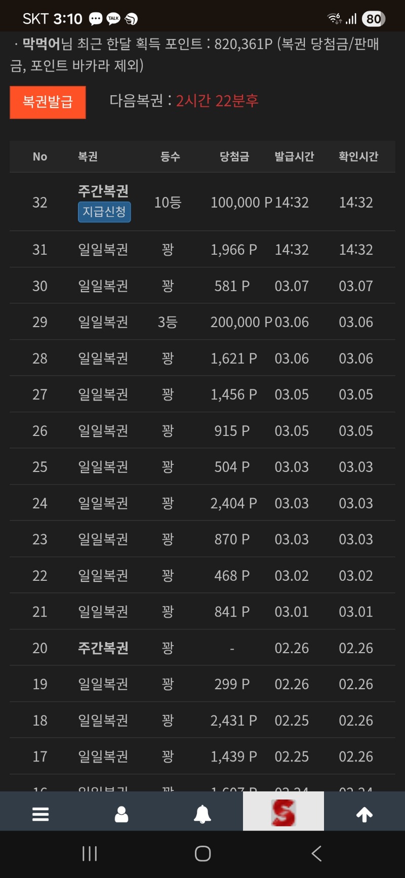주복당첨 막먹어 15 0 0 15:11:49 *기프티콘 바코드 노출 주의* <- 0 0 https://seulca1.com/bbs/board.php?bo_table=free&wr_id=3665051&page=6 Author 0 0 Lv.5 막먹어 5 595,845 (32%) 막먹어님 보유 포인트 : P 502,400 +15 03.09 주복당첨 +10 03.06 드뎌 3등 +18 03.01 만근신청 +1 02.22 [비밀글] 시안/짜몽아빠 +3 02.14 참여
