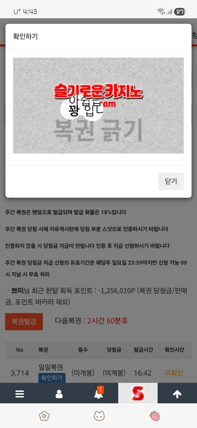 오후 복권 꽝 쁘띠 4 0 0 16:43:33 *기프티콘 바코드 노출 주의* <- 0 0 https://seulca1.com/bbs/board.php?bo_table=free&wr_id=3815217&page=7 Author 17 4 Lv.17 쁘띠 17 81,258,455 (37%) 쁘띠님 보유 포인트 : P 1,941,613 +2 04.20 저녁 복권 꽝 +4 04.20 오후 복권 꽝 +2 04.20 물개 수익 포인트 +1 04.20 활동왕 포인트 +23 04.20 헉~~일복 2등이닷~~!!