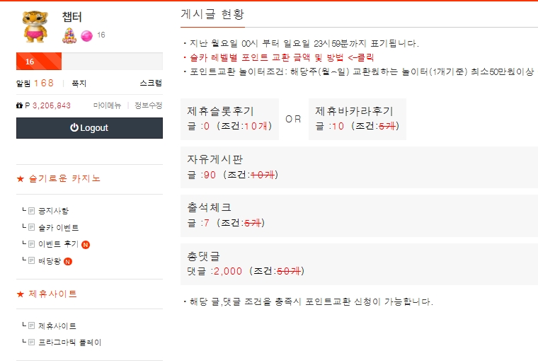이번주 주간숙제도 완료~ 챕터 3 0 0 12.14 20:07 *기프티콘 바코드 노출 주의* <- 에고 겨우 다했네요 ㅎㅎ 0 0 https://seulca1.com/bbs/board.php?bo_table=free&wr_id=3385144 Author 8 5 Lv.16 챕터 16 56,423,847 (32%) 챕터님 보유 포인트 : P 6,590,923 +6 12.15 일복 5등 당첨 +1 12.15 굿밤되세요 +2 12.14 슬용호 나락갈뻔하다 7연승으로 맨징 성공 +1 12.14 이번주도 주간숙제 완료 12.14 일요일 마무리 잘하세요