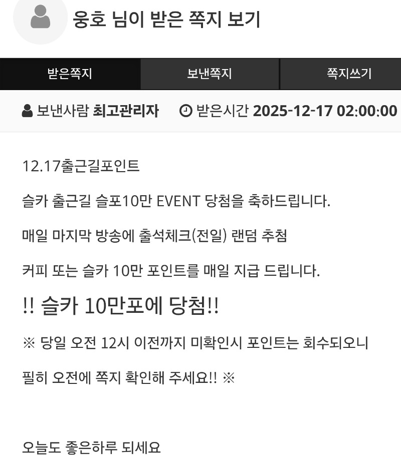 출근길 슬포 당첨! 웅호 5 0 0 05:19:13 *기프티콘 바코드 노출 주의* <- 출근길 슬포 당첨!!! 감사합니다^^ 0 0 https://seulca1.com/bbs/board.php?bo_table=free&wr_id=3392338 Author 1 0 Lv.12 웅호 12 13,900,062 (18%) 웅호님 보유 포인트 : P 671,656 +5 12.17 출근길 슬포 당첨! +17 12.17 오라메 918배 +12 12.17 오라메 379배 +8 12.17 오라메 329배 12.17 오늘도 출첵!!