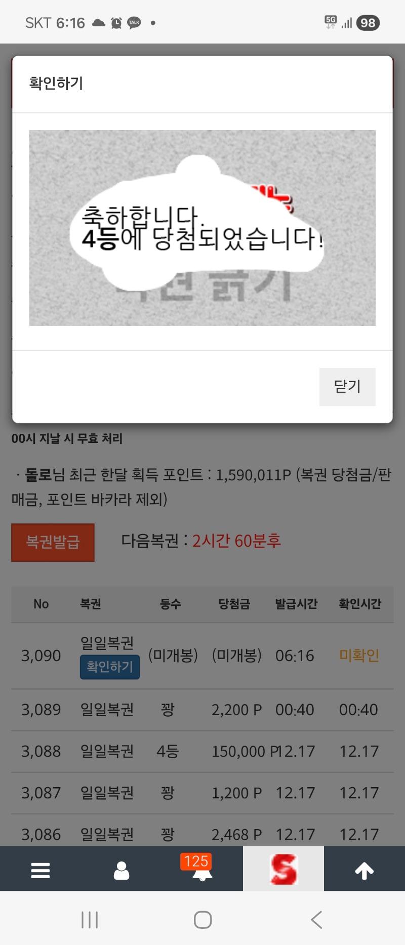 일복이4등 돌로 4 0 0 06:17:11 *기프티콘 바코드 노출 주의* <- 모닝복권 오랫만에. 당첨ㅅㅅ 0 0 https://seulca1.com/bbs/board.php?bo_table=free&wr_id=3395721 Author 3 0 Lv.15 돌로 15 31,470,030 (7%) 돌로님 보유 포인트 : P 2,345,978 +4 12.18 일복이4등 12.18 출석 +2 12.17 맛점하세요 12.17 출석 12.16 출석