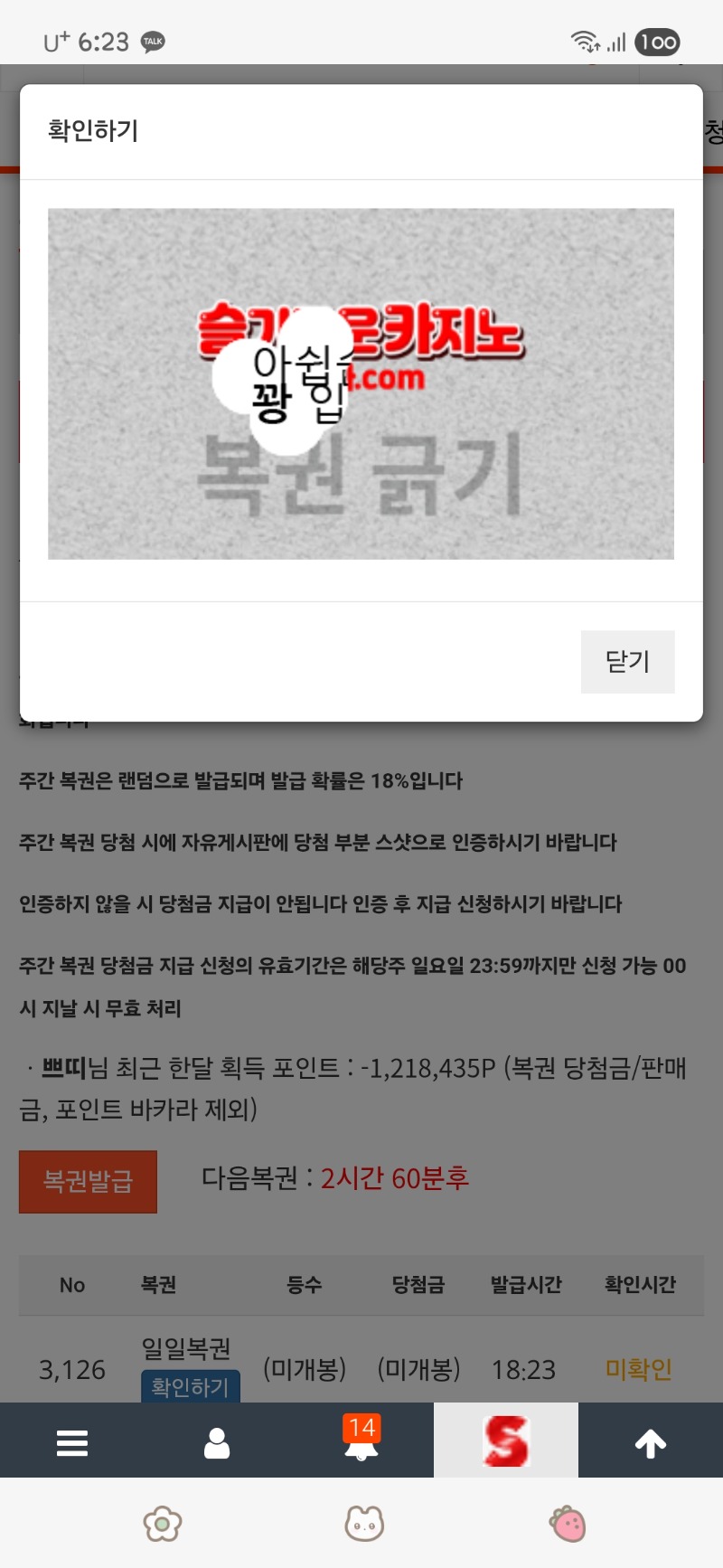 저녁 복권 꽝 쁘띠 1 0 0 18:24:00 *기프티콘 바코드 노출 주의* <- 0 0 https://seulca1.com/bbs/board.php?bo_table=free&wr_id=3397574 Author 15 4 Lv.17 쁘띠 17 71,816,425 (6%) 쁘띠님 보유 포인트 : P 889,291 +1 12.18 저녁 복권 꽝 +2 12.18 점심 복권 꽝 +14 12.18 얼음낚시 세번째도~~역시나~~ +13 12.18 얼음낚시 두번째 본전~~~ +12 12.18 오랫만에. 낚시. ~~~