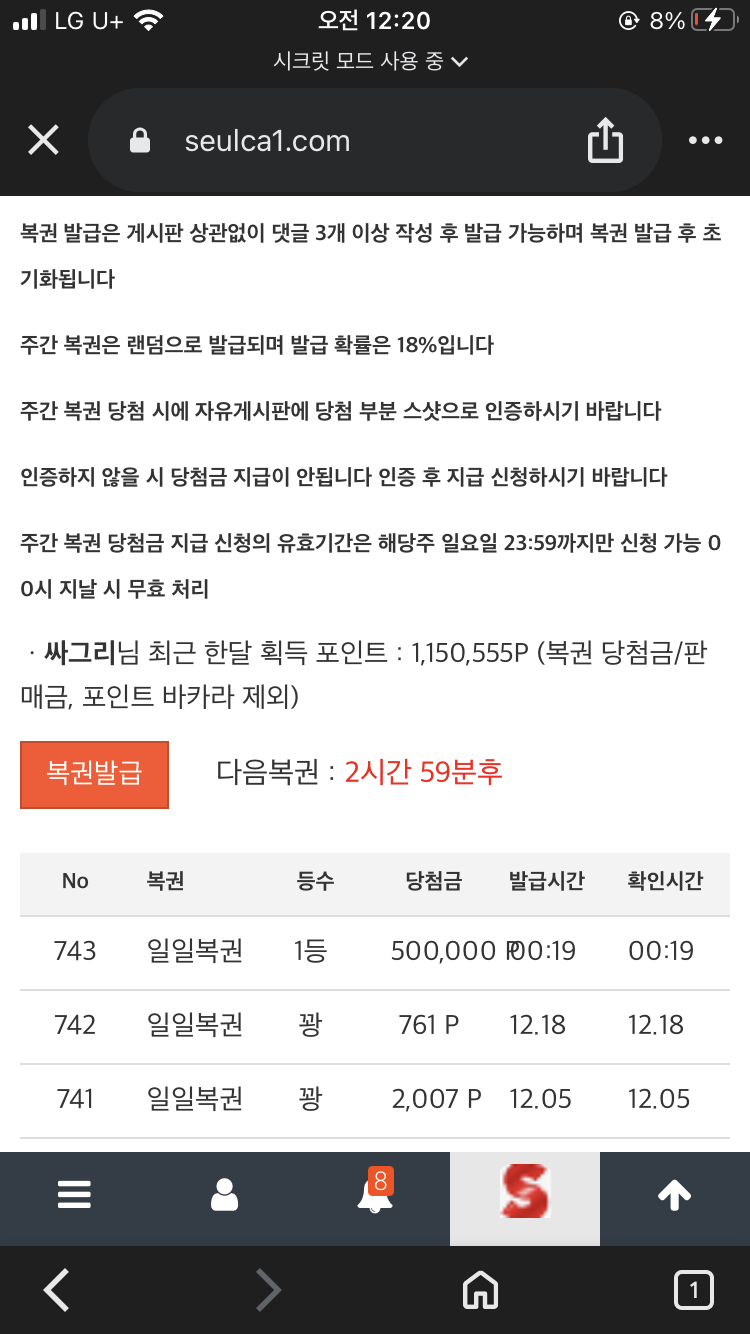 왠일로 1등이래 일복 ㅅㅅ 싸그리 9 1 0 00:22:23 *기프티콘 바코드 노출 주의* <- 복권하도 안줘서ㅜ기대도 안했는데 1등 ㅎㅎ 1 0 https://seulca1.com/bbs/board.php?bo_table=free&wr_id=3398535 Author 0 0 Lv.9 싸그리 9 5,078,144 (26%) 싸그리님 보유 포인트 : P 0 +2 12.19 차분하게 포인트 업 +9 12.19 왠일로 1등이래 일복 ㅅㅅ +41 12.09 오라메 293배 +1 12.05 [비밀글] 배민 +1 12.05 족발 배민