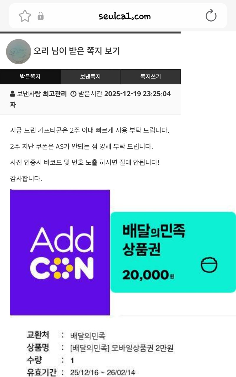 사자님 감사합니다!!잘먹을게요 오리 3 1 0 12.19 23:30 *기프티콘 바코드 노출 주의* <- 1 0 https://seulca1.com/bbs/board.php?bo_table=free&wr_id=3401184 Author 2 0 Lv.10 오리 10 9,614,713 (80%) 오리님 보유 포인트 : P 105,617 +3 12.19 사자님 감사합니다!!잘먹을게요 +1 12.13 물개님 추천게임 맥스!! 12.05 오늘의 저녁은!! +12 12.04 오늘의저녁은 쭈삼!! +11 12.03 주문하신 감바스도착이요