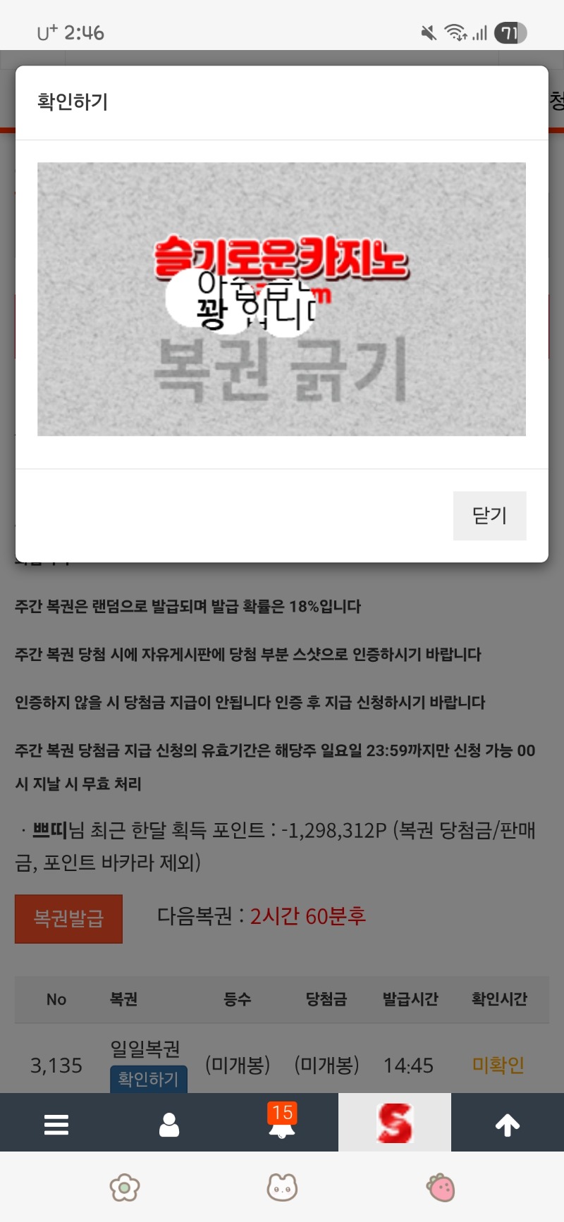 다시 꽝 모드네~ 쁘띠 0 0 0 14:46:28 *기프티콘 바코드 노출 주의* <- 0 0 https://seulca1.com/bbs/board.php?bo_table=free&wr_id=3402407 Author 15 4 Lv.17 쁘띠 17 71,971,469 (6%) 쁘띠님 보유 포인트 : P 1,038,319 12.20 다시 꽝 모드네~ 12.20 출첵 +2 12.20 첫복권 꽝 +1 12.19 점심 복권 꽝 +10 12.19 토라메 168배