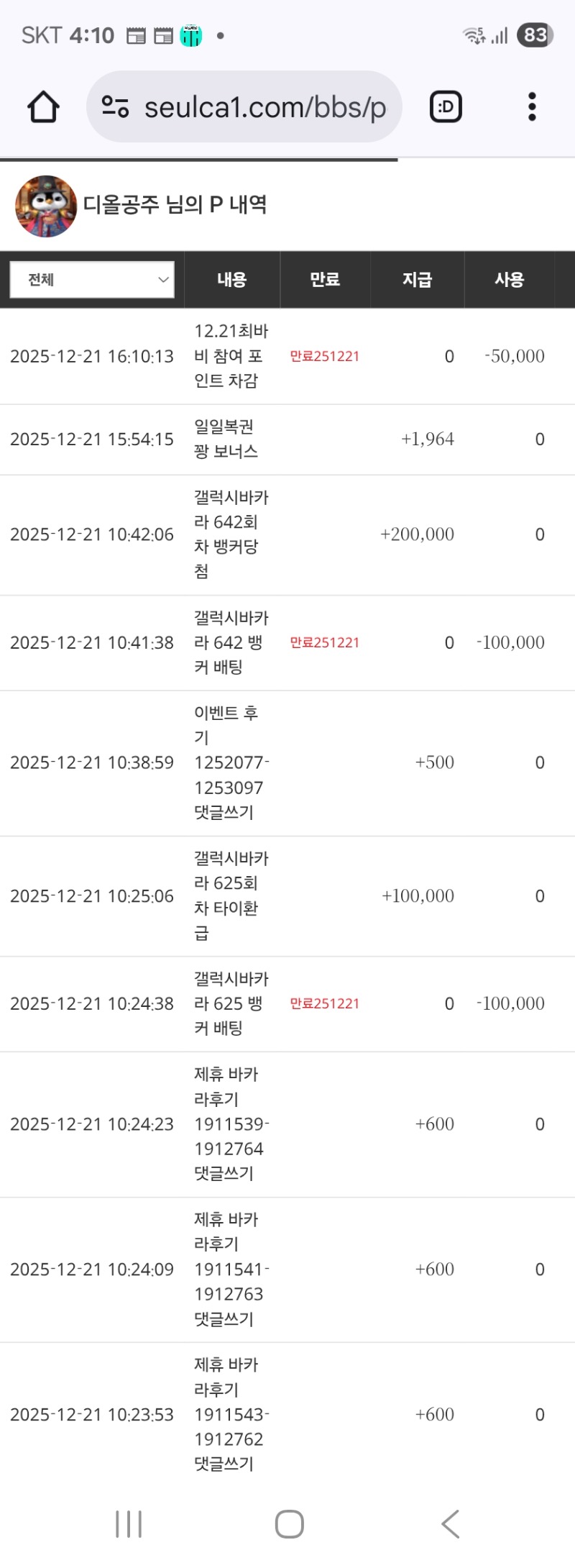 최바비 참가비 차감 디올공주 0 0 0 16:11:24 *기프티콘 바코드 노출 주의* <- 0 0 https://seulca1.com/bbs/board.php?bo_table=free&wr_id=3404967 Author 18 11 Lv.18 디올공주 18 150,165,191 (83%) 디올공주님 보유 포인트 : P 917,453 12.21 최바비 참가비 차감 +14 12.21 슈천 1141배 +40 12.21 슈천 1141배 +70 12.21 럭피396배*600냥 +60 12.21 멀린 988배