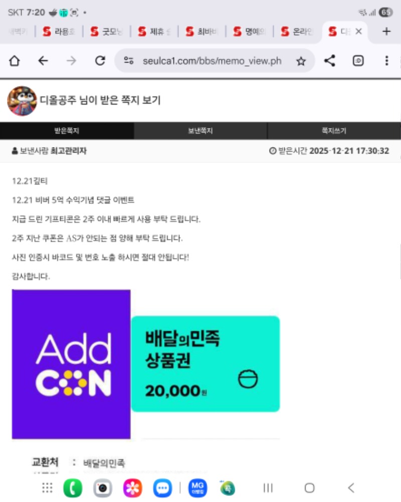 비버님 수익기념 배민쿠폰 ㅅㅅ 디올공주 2 0 0 19:29:32 *기프티콘 바코드 노출 주의* <- 0 0 https://seulca1.com/bbs/board.php?bo_table=free&wr_id=3405578 Author 18 11 Lv.18 디올공주 18 150,208,784 (83%) 디올공주님 보유 포인트 : P 961,726 +3 12.21 시안돌발 갓짜 +2 12.21 비버님 수익기념 배민쿠폰 ㅅㅅ +6 12.21 맛저하세요 ~ 12.21 최바비 참가비 차감 +18 12.21 슈천 1141배