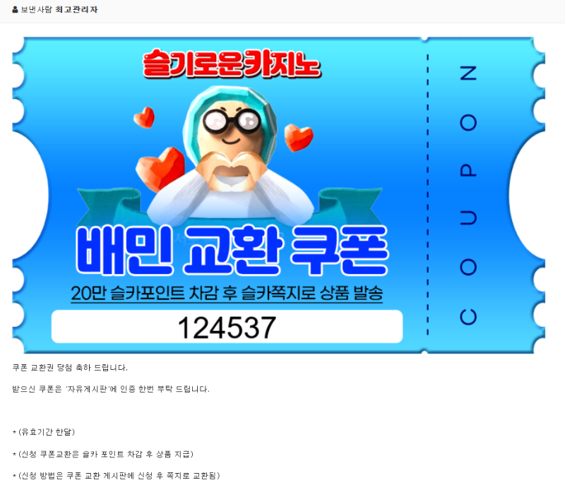 양이 추게임 성공 배민쿱 나대로기사 1 0 0 12.21 22:18 *기프티콘 바코드 노출 주의* <- 0 0 https://seulca1.com/bbs/board.php?bo_table=free&wr_id=3405972 Author 3 1 Lv.11 나대로기사 11 11,539,164 (51%) 나대로기사님 보유 포인트 : P 1,195,562 +1 12.21 [비밀글] 양이추겜성공 배민쿠폰 +1 12.21 [비밀글] 포인트교환 신청합니다~ +1 12.21 양이 추게임 성공 배민쿱 12.21 포인트가 필요합니다~~ +2 12.21 오늘 활동해서 50만포 만들어야 되나요??