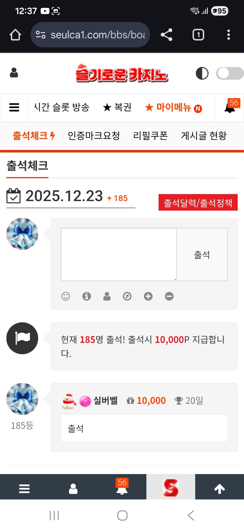 출석하고 ~~ 실버벨 0 0 0 00:38:26 *기프티콘 바코드 노출 주의* <- 0 0 https://seulca1.com/bbs/board.php?bo_table=free&wr_id=3409288 Author 10 7 Lv.18 실버벨 18 133,833,026 (56%) 실버벨님 보유 포인트 : P 3,223,482 12.23 이번에는퐁당.., , 내가가면? +2 12.23 이 긴장줄 내가가면? +4 12.23 3패네... +1 12.23 갠찮아 마틴가면 되지~~ +1 12.23 바카라1패