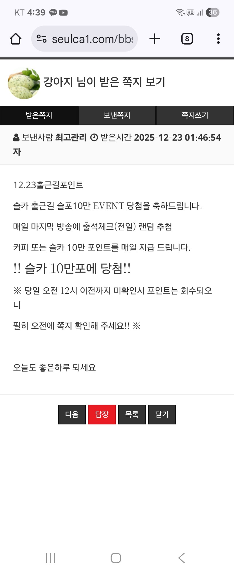 앗 내가 출근포에 당첨이 되다니^^ 강아지 6 0 0 04:41:58 *기프티콘 바코드 노출 주의* <- 0 0 https://seulca1.com/bbs/board.php?bo_table=free&wr_id=3409497 Author 0 0 Lv.12 강아지 12 13,713,151 (14%) 강아지님 보유 포인트 : P 441,519 +6 12.23 앗 내가 출근포에 당첨이 되다니^^ 12.23 출책 합니다 +6 12.22 좀비스쿨 196배 +4 12.22 활동포인트 받았네요~~~ +1 12.21 [비밀글] 포인트교환