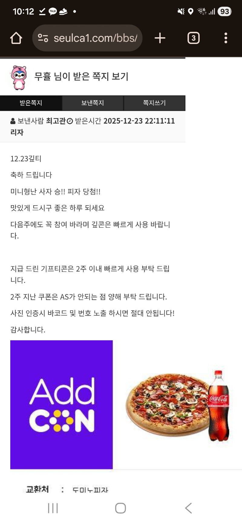미형 피자당첨! 무휼 2 0 0 12.23 22:13 *기프티콘 바코드 노출 주의* <- 0 0 https://seulca1.com/bbs/board.php?bo_table=free&wr_id=3411569 Author 7 0 Lv.12 무휼 12 16,966,310 (79%) 무휼님 보유 포인트 : P 146,401 12.24 출석! +2 12.23 미형 피자당첨! 12.23 비가오네요!ㅎ 12.23 즐퇴하세요 +4 12.23 맛점하세요ㅎ저는카레돈까스ㅇ.ㅇ