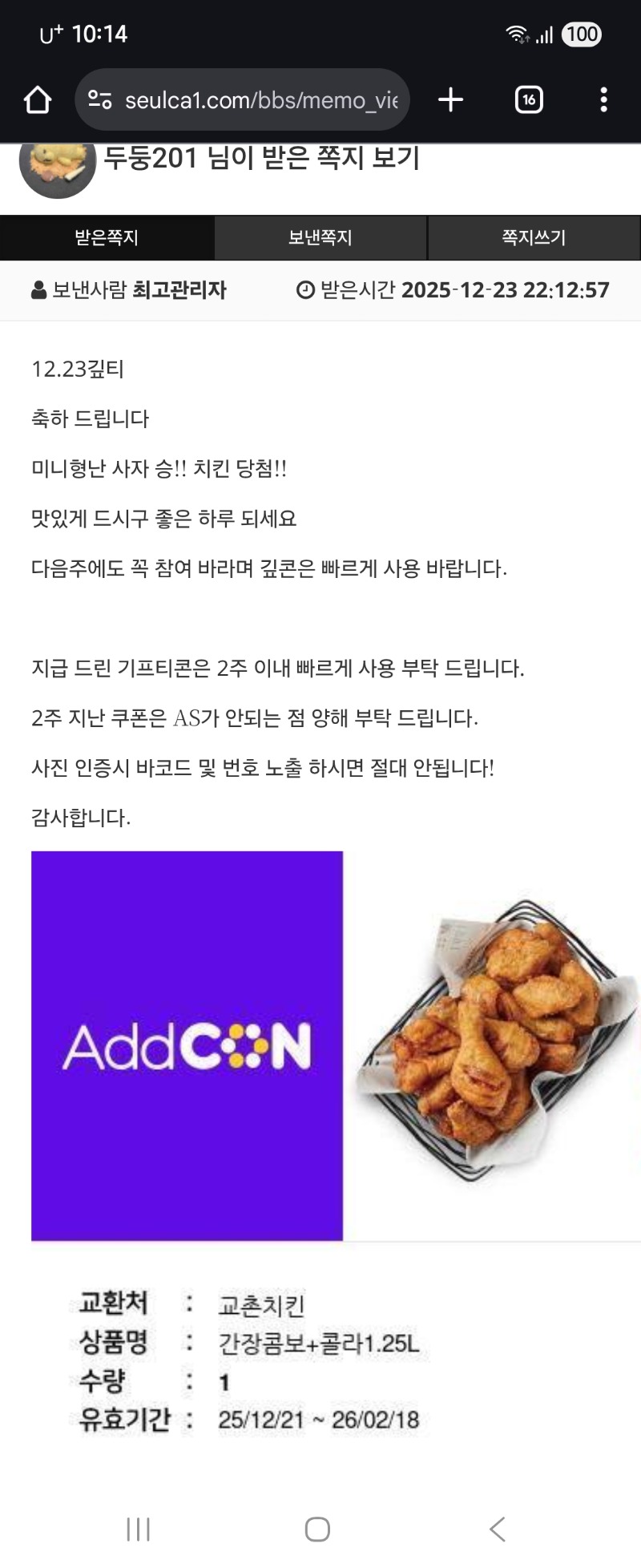 형난사자승리 치킨쿱 감사합니다 두둥201 3 0 0 12.23 22:15 형난*기프티콘 바코드 노출 주의* <- 0 0 https://seulca1.com/bbs/board.php?bo_table=free&wr_id=3411578 Author 0 0 Lv.10 두둥201 10 9,357,941 (67%) 두둥201님 보유 포인트 : P 584,458 +3 12.23 형난사자승리 치킨쿱 감사합니다 +3 12.13 출근길 커피 감사합니다ㅎ +19 12.06 토라메723배 +14 12.06 슈천 169 12.06 주말잘보내세요