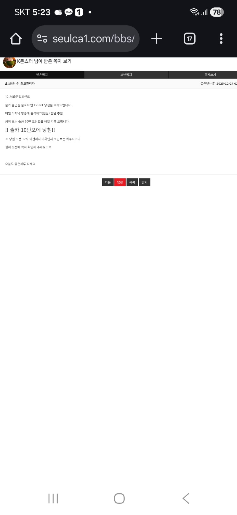 오랜만에 출근포 당첨 K몬스터 4 1 0 05:24:44 *기프티콘 바코드 노출 주의* <- 얼마만인지 ㅎㅎ 깡치기 가즈아~~^^ 1 0 https://seulca1.com/bbs/board.php?bo_table=free&wr_id=3412122 Author 12 3 Lv.15 K몬스터 15 37,493,072 (37%) K몬스터님 보유 포인트 : P 114,928 +4 12.24 오랜만에 출근포 당첨 +36 12.23 와일드갱 3317배 +6 12.23 와일드갱 3317배 +6 12.23 건담123배 +8 12.23 건담205배