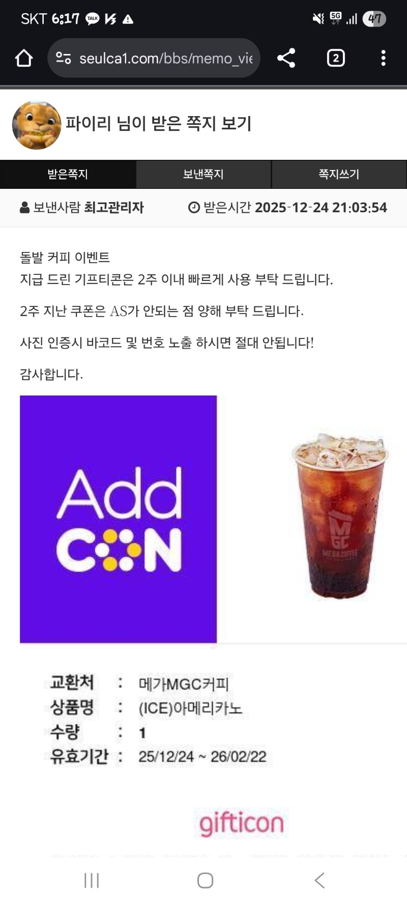 어제 돌발 사자커피인증! 파이리 0 0 0 06:17:40 *기프티콘 바코드 노출 주의* <- 0 0 https://seulca1.com/bbs/board.php?bo_table=free&wr_id=3414922 Author 2 1 Lv.11 파이리 11 12,727,691 (90%) 파이리님 보유 포인트 : P 8,854,252 12.25 다들 메리크리스마스 입니다!!! 12.25 어제 돌발 사자커피인증! +4 12.24 슬카라 괜히 견드렸네;; +2 12.24 오늘만 쌍복3번째;; +6 12.24 비벼 수익 포인트 쓰윽~